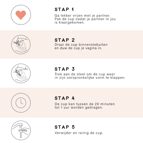 Stap 2 Bedrijf de liefde met uw partner. Pak de cup nadat je partner in jou is klaargekomen. Probeer daarbij niet te zitten en sta niet op, zo voorkom je dat sperma uit de vagina loopt. Draai de cup binnenstebuiten tot deze eruitziet als een paraplu. Houd de FERTI·LILY Conceptie Cup zo vast dat de steel richting jouw voeten wijst en houd een vinger binnen de parapluvorm.